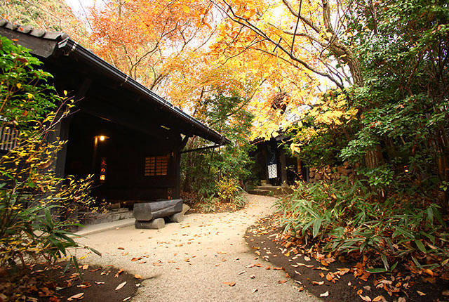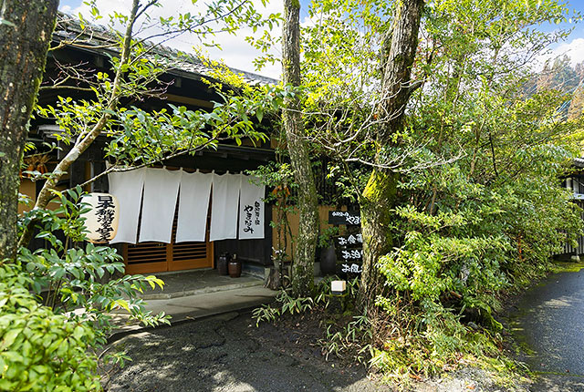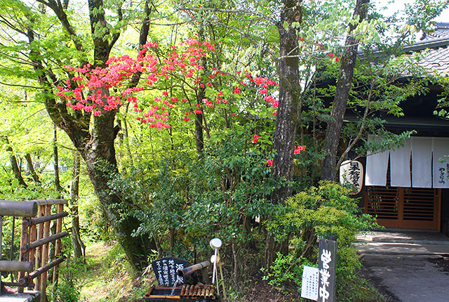 駐車場から川に掛かった小さな橋を渡ると、木々に抱かれた平屋建ての宿がお客様をお迎えします。